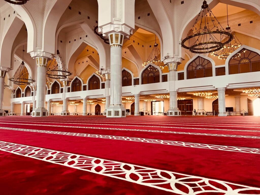 Inside, the mosque features a centrally air-conditioned main hall with beautifully crafted carpets, accommodating up to 11,000 men for prayers. An adjacent, spacious enclosure provides room for 1,200 women. The mosque is easily accessible, with three main entrances and 17 side entrances.