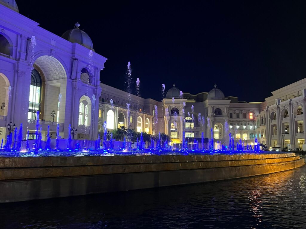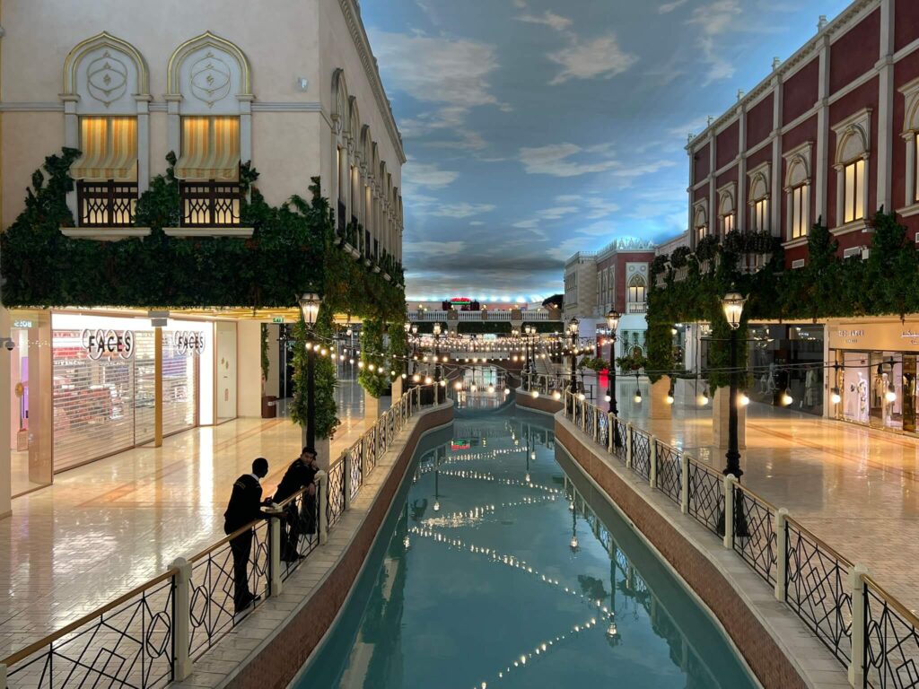Villagio Mall, spanning over 40 acres, is a shopping destination designed to evoke the charm of Venice. The mall features an indoor canal where visitors can enjoy gondola rides, as well as bridges reminiscent of those in Venice. Decorative elements and light projections throughout the space further enhance the Italian ambiance.