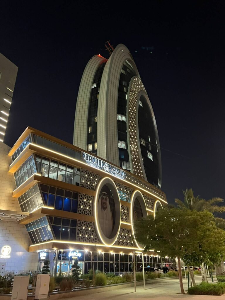 Located just outside the entrance to Villagio Mall is the iconic ‘Doha Torch,’ one of Qatar’s most recognizable landmarks. Since 2007, this striking structure has stood among the tallest in the country, renowned for its unique flame-inspired design. Rising to 984 feet, The Torch is a luxury hotel featuring 163 upscale rooms across 51 floors. Guests can enjoy fine dining, swimming pools, and sweeping panoramic views of the neighboring Aspire Park.