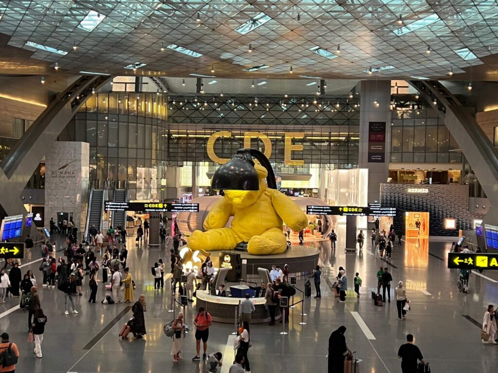 The “Large Bear Statue” at Hamad International Airport in Doha is officially titled “Untitled (Lamp/Bear)” and was created by Swiss artist Urs Fischer. This monumental sculpture features a 23-foot-tall canary yellow teddy bear sitting beneath a lamp. Crafted from bronze, it has become a well-known landmark and a favourite photo spot for travellers.