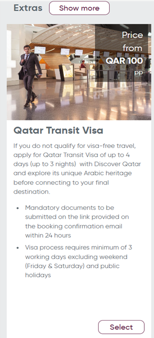 Once you have finalized your hotel booking, you can add the “Qatar Transit Visa” as an extra option.